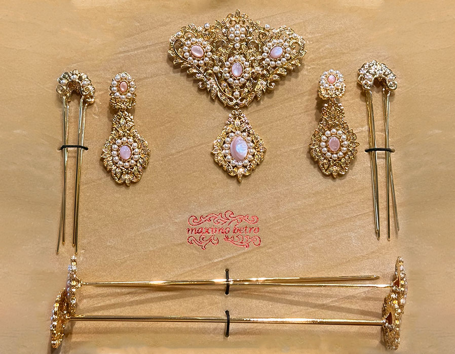 Aderezo de valenciana bañado en oro, con piedras en nacar rosa y perlas.
