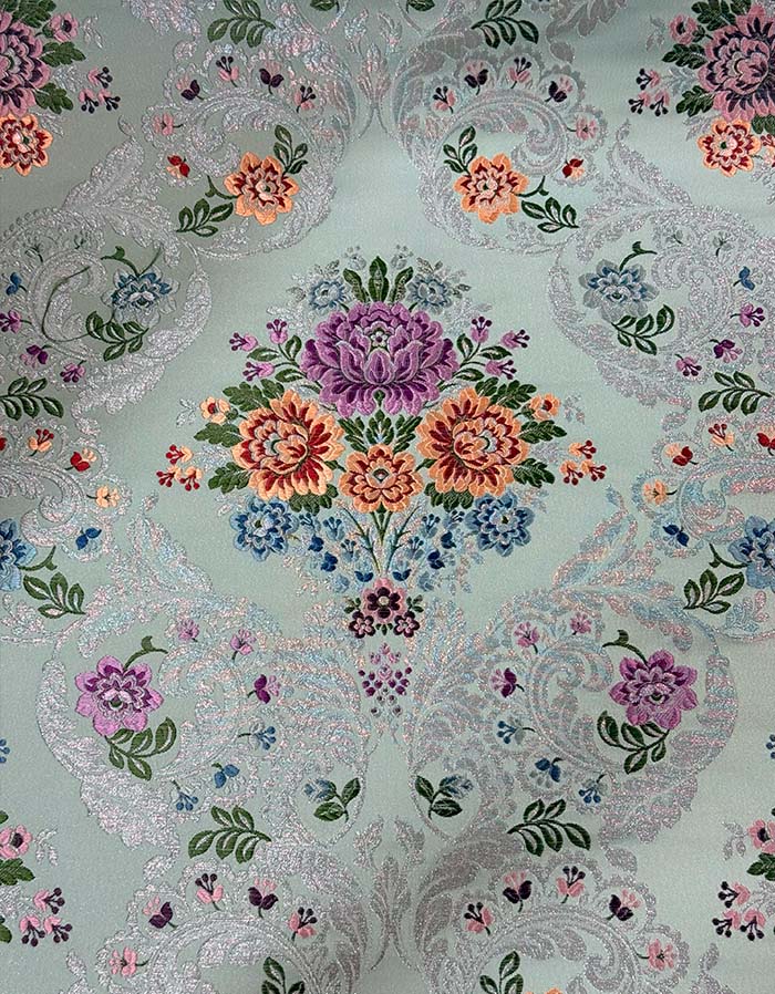 Corte de tela valenciana de 5,5 metros. Fondo de color nectaris y trama plata.