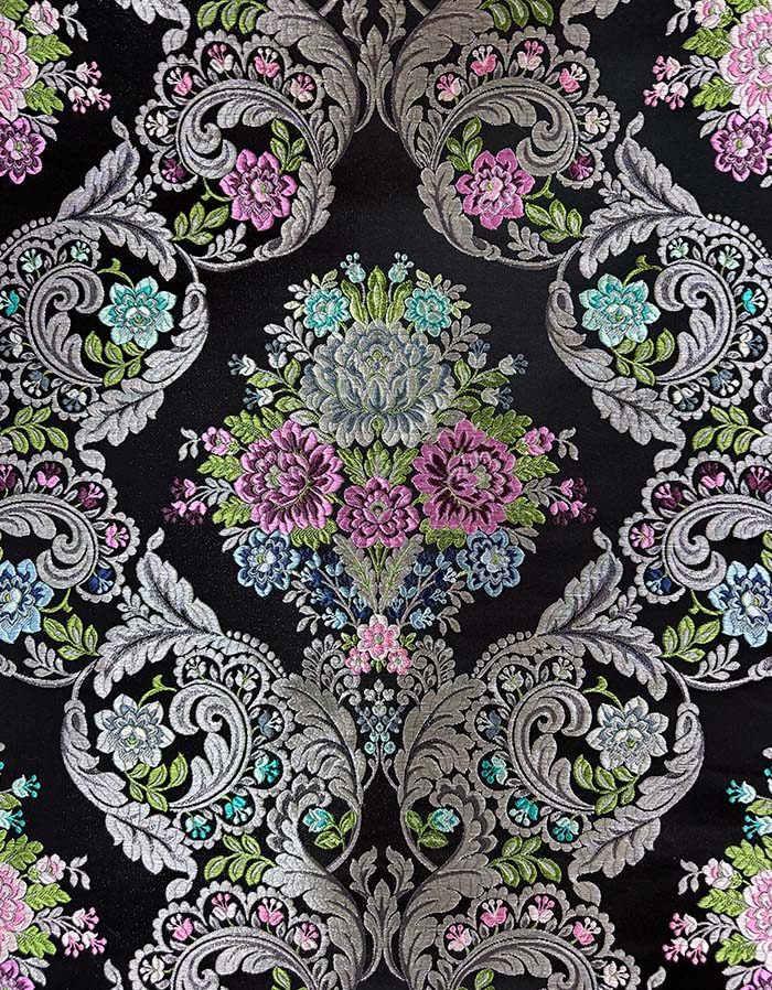 Corte de tela valenciana de 5,5 metros. Fondo de color negro. Trama PLATA.