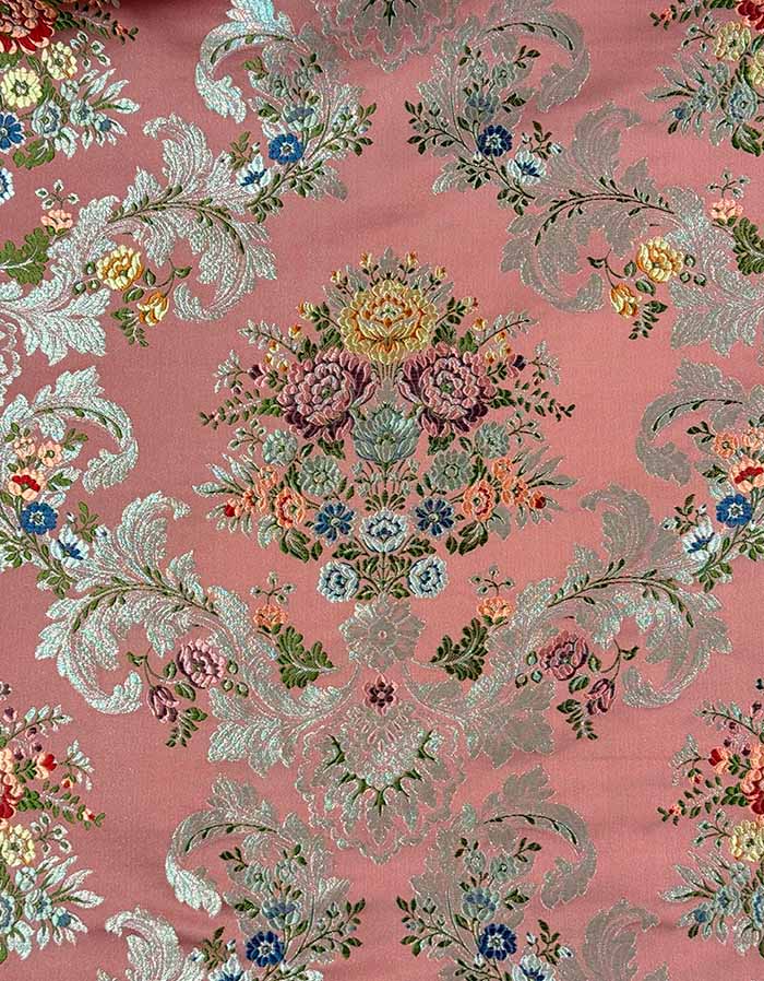 Corte de tela valenciana de 5,5 metros. Fondo de color rosa palo y trama plata.